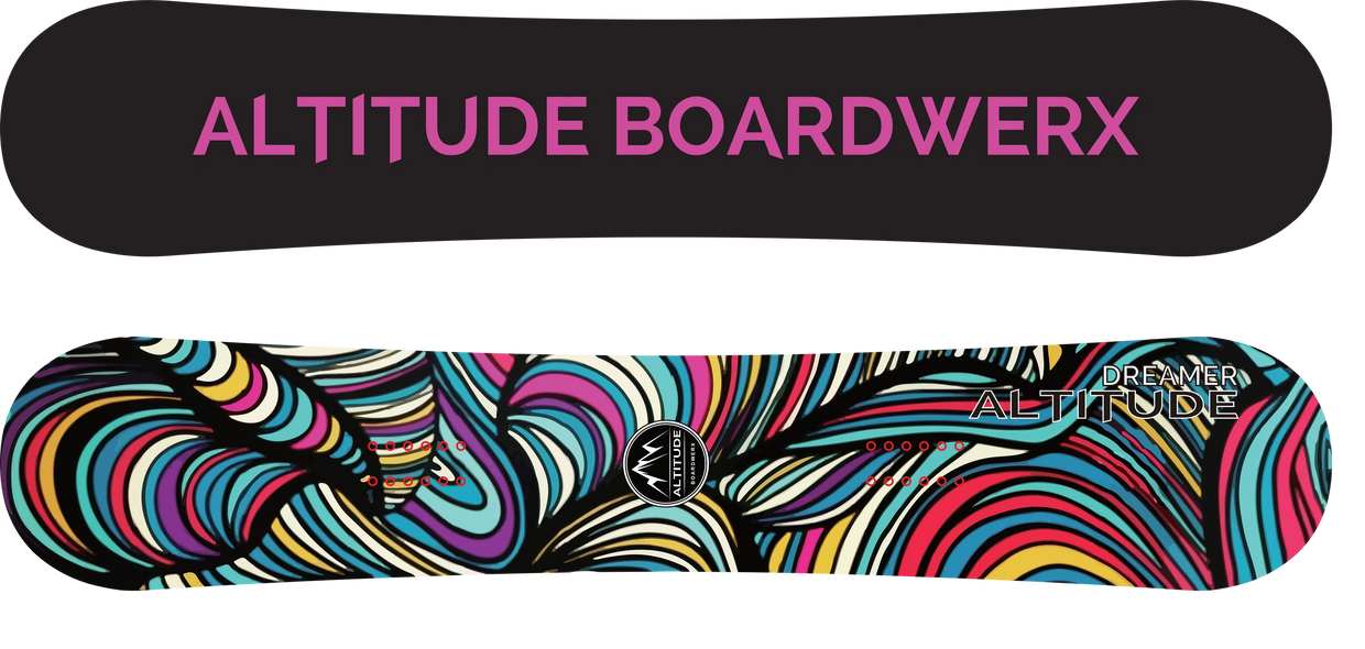 The women’s Altitude “Dreamer” snowboard is ideal, with the camber providing stability and the rocker tip and tail assisting with turns and making the ride catch-free. This all-mountain snowboard includes versatility, better float on the snow, and easy turning capabilities.